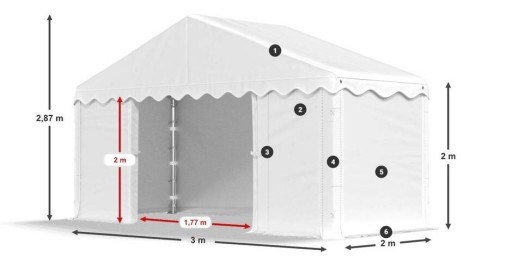 1 - Dach PE (polietylen) 240g/m2 2 - Brama typu kurtyna 3 - Mocne zamki YKK przy wjazdach 4 - Wymienne maskownice 5 - Ściany boczne PE ok. 2 x 2 m (polietylen) 240g/m2 6 - Oczka mocujące plandekę