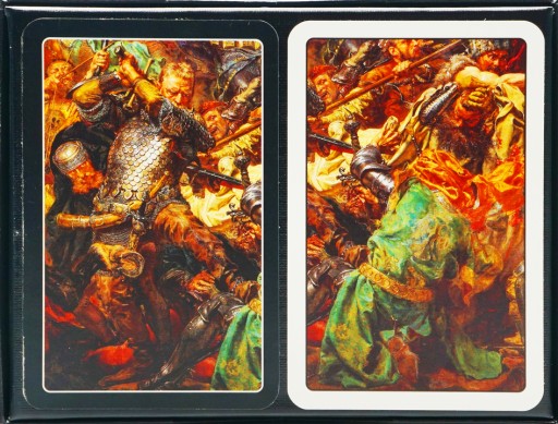 Karty wyprodukowane z okazji 600 rocznicy bitwy pod Grunwaldem. W komplecie 2 talie w eleganckim pudełku z charakterystyczną Piatnikowską poduszeczką. Na rewersach i figurach fragmenty obrazu Jana Matejki. Talie składają się z 55 plastikowanych kart o wymiarach 58 x 89 mm i gramaturze 310. Idealne zarówno do brydża, pokera, remika jak i innych gier.