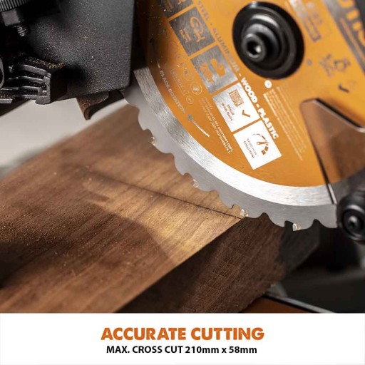 - Parametry cięcia: 0º x 0º ukośne (maks. przekrój)- 210 x 58mm, 45º skos x 0º skos- 145 x 58mm, 0º kątowy x 45º skos- 210 x 40mm, 45° kątownik x 45° kątownik- 145 x 40 mm, Zakres kątów ukośnych podstawy 50°- 50°, Zakres skosu głowicy tnącej 0°- 45°