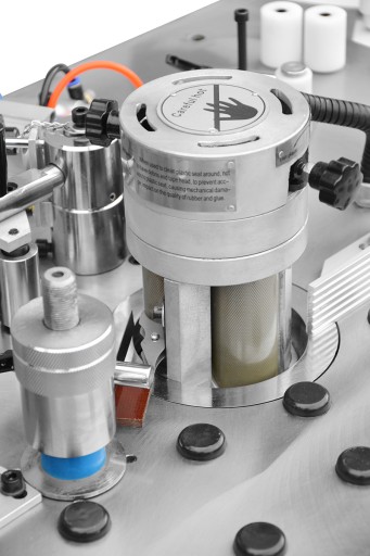 Nożyce pneumatyczne do obcinania obrzeża (taśmy przyklejanej). Solidna mocna konstrukcja. Maszyna ta podaje, obcina i przykleja obrzeże. Regulowane rolki kulkowe, umożliwiają swobodne prowadzenie przy rolce klejącej.