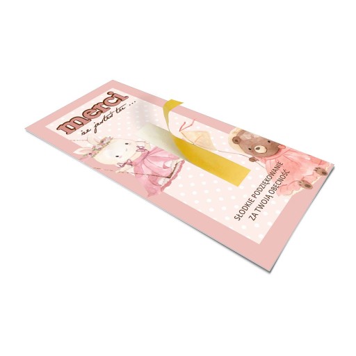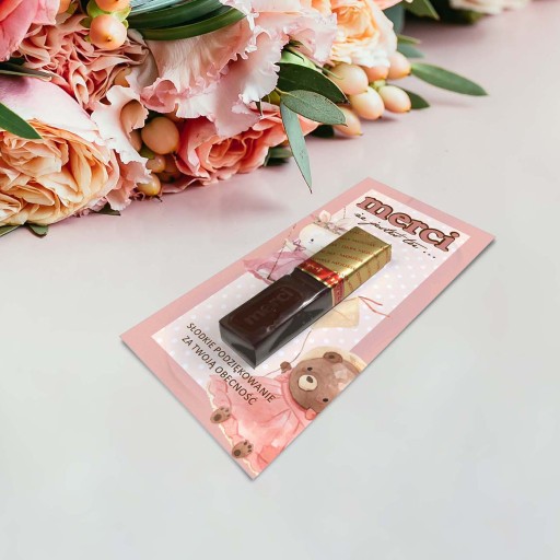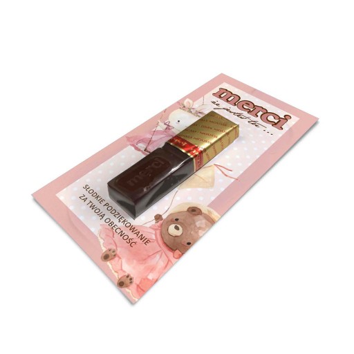 Oryginalny pomysł na podziękowanie gościom w formie podkładki do czekoladek. Słodkie podziękowanie wykonane ze sztywnego białego papieru z precyzyjnym drukiem cyfrowym z uroczym króliczkiem pięknie ozdobi stół przygotowany na imprezę, jak również będzie miłą niespodzianką dla gości.