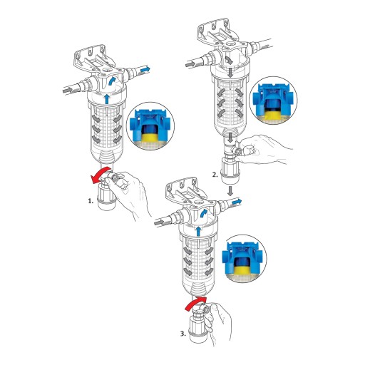 W celu wypłukania wkładu RAH należy otworzyć zawór kulowy, znajdujący się na dnie klosza. Uruchomi się w ten sposób płukanie wsteczne, które wypłucze zanieczyszczenia zatrzymane przez wkład.