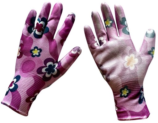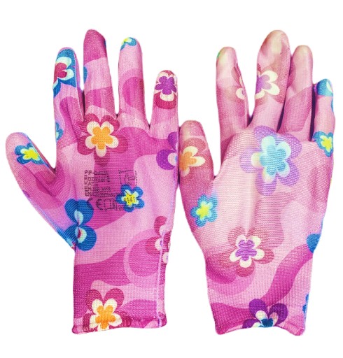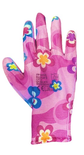 Rękawice robocze, ochronne, damskie, w kwiatowe wzory, poliestrowe, powlekane w części chwytnej poliuretanem - DALIA.