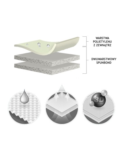 Góra pokrowca wykonana jest z 3-warstwowego materiału - dwuwarstwowy SPUNBOND powleczony od zewnątrz POLIETYLENEM o dużej odporności na promienie UV i opady atmosferyczne.