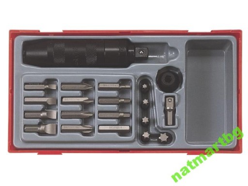 Teng Tools Jakość przemysłowa. Zestaw zawiera wkrętak udarowy 1/2", trzpień do osadzania grotów, adapter 5/16"- 3/8 "□, oraz 17 grotów wymiennych. Dostarczany w pojemniku tworzywowym z odłączaną pokrywą. Pasuje do skrzynek i wózków narzędziowych Teng Tools.