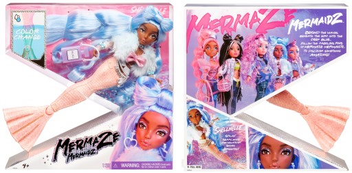 ZMIENIAJĄCY KOLOR OGON: Każda lalka Mermaze Mermaidz ma wyjątkowy, wyrzeźbiony ogon, który po zanurzeniu w ciepłej wodzie spektakularnie zmienia kolor. Zobacz, jak jego odcień przechodzi z metalicznego fioletu i gorącego różu w srebrny chrom.