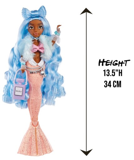 Lalka modowa Shellnelle ma realistyczny, wyrzeźbiony ogon, który po zanurzeniu w ciepłej wodzie spektakularnie zmienia kolor. Zobacz, jak jego odcień przechodzi z koralowego w turkusowy. Ogon zmienia się również w stojak, gdy zegniesz płetwę pod kątem 90 stopni. Każda syrena Mermaze Mermaidz zgina się w szyi, ramionach, łokciach, nadgarstkach, tułowiu, talii, płetwie i w kolanach, dzięki czemu możesz stworzyć wiele póz!