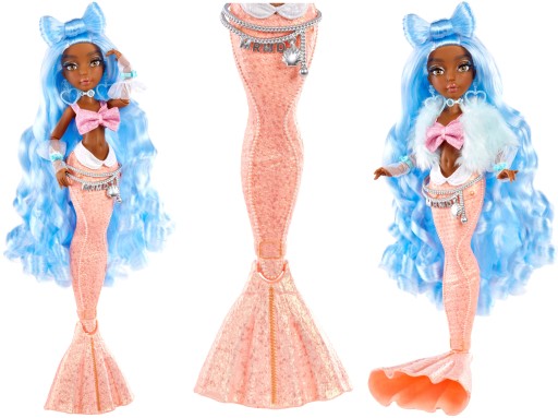 Zestaw zawiera w pełni giętką i ruchomą lalkę syrenę ze zmieniającym kolor ogonem, topem, kurtką, 2 paskami, mankietami, kolczykami i torebką.