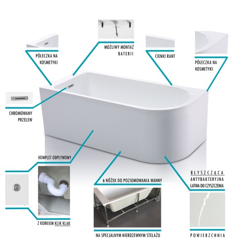 - CIEPŁA POWIERZCHNIA - akryl jest bardzo dobrym izolatorem, jest ciepły w dotyku i nie pozwala by woda znajdująca się w wannie szybko traciła temperaturę. Pozwoli to państwu spokojnie cieszyć się długą kąpielą.