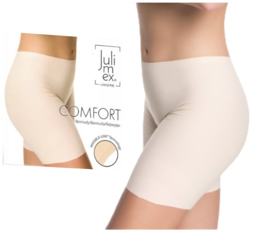 Niewidoczne pod ubraniem dzięki bezszwowej, nowoczesnej technologii wykończenia brzegów Julimex INVISIBLE-LINE®. Dół wykończony delikatnie, dzięki czemu nie wciska się w uda. Te elastyczne, beżowe majtki damskie z miękkiej dzianiny gwarantują wygodę i ukrywają niedoskonałości. Dłuższe nogawki zapobiegają bolesnym i nieprzyjemnym obtarciom ud. Z myślą o higienie kobiet została dodana bawełniana wkładka. Bermudy dostępne są także w czarnej wersji.