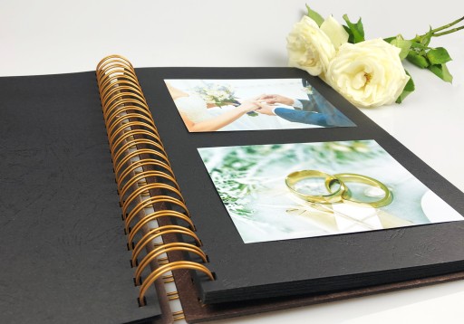 - metalowa, złota spirala o dużych oczkach, dzięki którym nawet zapełniony album będzie się bezproblemowo otwierał