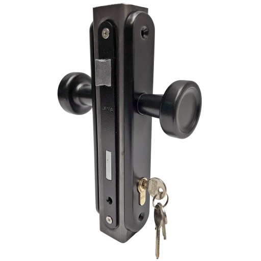 - gałko-gałka obrotowa - aluminiowa, rozstaw 90 mm, stalowy szyld malowany proszkowo, kolor czarny, otwieranie poprzez przekręcenie (działa jak klamka), trzpień: 85 x 8 mm