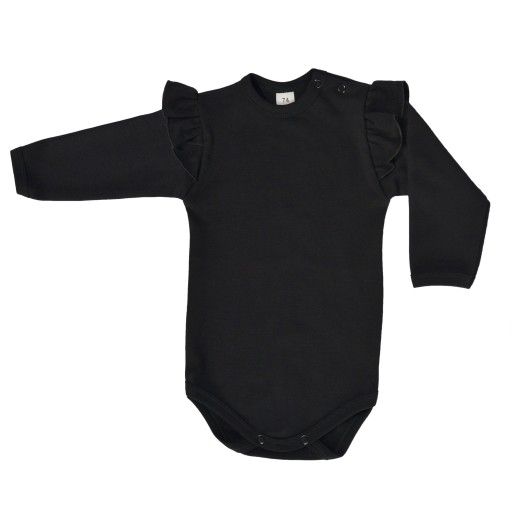 Klasyczne, wygodne i praktyczne czarne body z długim rękawkiem i falbanką na ramionkach uszyte z wysokiej jakości bawełny posiadającej certyfikat Oeko-Tex Standard 100 Tekstylia godne zaufania.