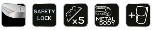W komplecie 5 ostrzy trapezowych w praktycznej kasetce.