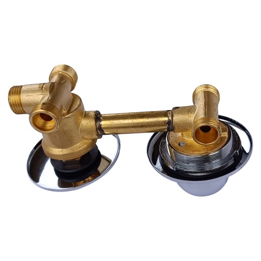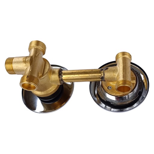 Solidna, mosiężna bateria do kabiny prysznicowej z hydromasażem / paneli prysznicowych i natryskowych posiadająca z jednej strony podłączenia do zimnej oraz ciepłej wody na wężyki 1/2" (mieszacz) a z drugiej strony na 3 funkcje / źródła natrysku również na wężyki przykręcane na 1/2" (rozdzielacz funkcji) jak np. na: