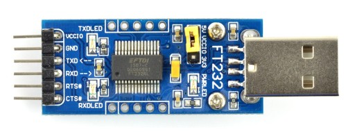Konwerter, który umożliwia komunikację pomiędzy interfejsami szeregowymi USB i UART. Pozwala na wymianę danych między komputerem a układami wykorzystującymi mikrokontrolery. Moduł oparty na układzie FT232RL. W systemie operacyjnym widoczny jako wirtualny port COM.