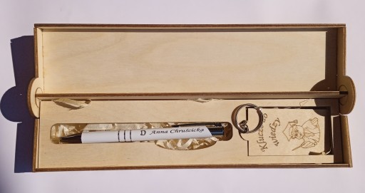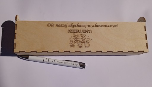 - Drewniane etui, na którego wieczku umieszczamy grafikę (widoczną na zdjęciu i napis dziękujemy) oraz Twój własny tekst (Dla kogo, imiona dzieci itp)