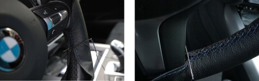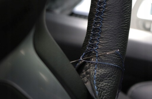 3. Obszywamy kierownicę, przeplatając nitkę przez co drugi ścieg, wykonując ruchy w kształcie litery S. Należy pamiętać, że zahaczamy tylko o nitkę, nie dziurawiąc skóry.