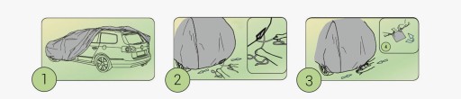 - Plandeka na auto mocowana jest za pomocą pewnego ściągacza z linką wokół całego samochodu, co gwarantuje bezpieczeństwo nawet w razie silnych podmuchów wiatru.