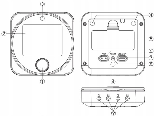 - LED/UNIT: Podświetlenie wł./wył., przełącznik jednostki temperatury