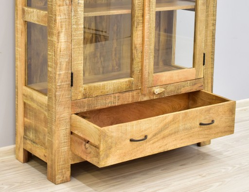 Indyjska witryna kolonialna pod postacią masywnej bryły wyposażonej w cztery przestrzenne wnęki umiejscowione za przeszklonymi skrzydłami oraz jedną pojemną szufladę na dole mebla. Witryna posiada również przeszklone boki. Całość wykonana została z litego drewna mango z utrzymaniem stylistyki loft.