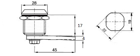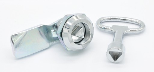 Opis: wysokiej jakości zamek wykonany z metalu w kolorze ocynk srebrny. Czoło zamka widoczne od strony klucza jest niklowane. Elementem zamykającym jest metalowy języczek (rygiel). Języczek po przekręceniu klucza przesuwa się o 90 stopni. Zamek jest blokowany nakrętką montażową. Języczek nasadzony jest na trzpieniu w kształcie kwadratu i mocowany jest do korpusu zamka śrubą. Zamek jest mocną, solidną konstrukcją. Języczek zamykający ma 4 mm grubości. Zamki te można stosować w szafach energetycznych, włazach technicznych w sprzęcie budowlanym, kolejowym, okrętowym itp.