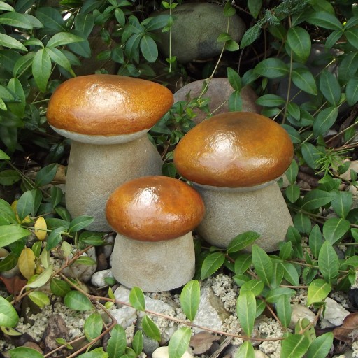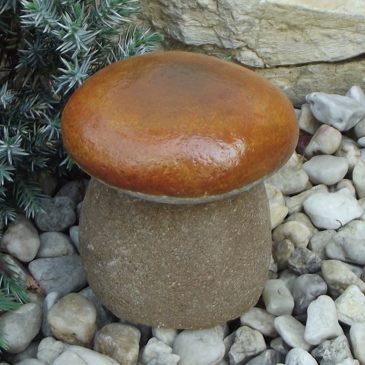 Grzyb borowik wykonany z naturalnego kamienia. Figurki są trwałe i odporne na warunki atmosferyczne, mogą zimować w ogrodzie. Kształt uformowanych przez naturę kamieni sprawia że każdy grzybek jest inny niepowtarzalny. Ustawione w ogrodzie pod tujami, iglakami, na skalniaku czy korze wyglądają jak prawdziwe.
