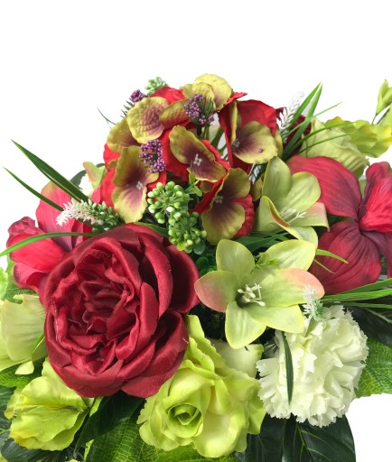 Kompozycja kwiatowa została wykonana z najwyższej jakości kwiatów sztucznych i dodatków. Do stworzenia dekoracji zostały wykorzystane angielskie róże, mieczyki, hortensja, gerberki, małe lilie, duża ilość zielonych liści oraz dodatków, idealnie wypełniająca puste przestrzenie.