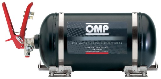Mechaniczny system gaśniczy OMP z kolekcji Black. Kolekcja ta charakteryzuje się wykonaniem butli systemu z solidnego stopu stali.