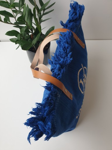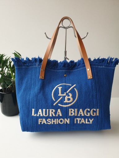 Torba shopper Laura Biaggi wykonana z wytrzymałego materiału typu płótno w kolorze niebieskim z brązowymi skórzanymi uchwytami.