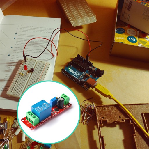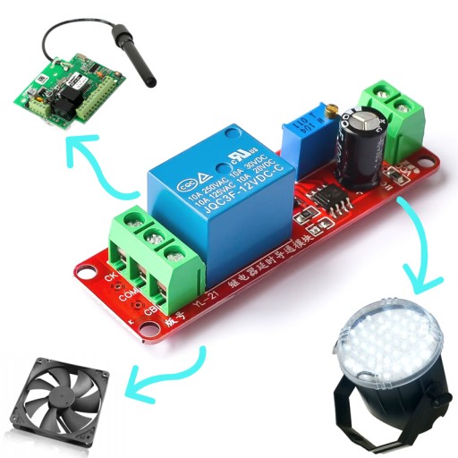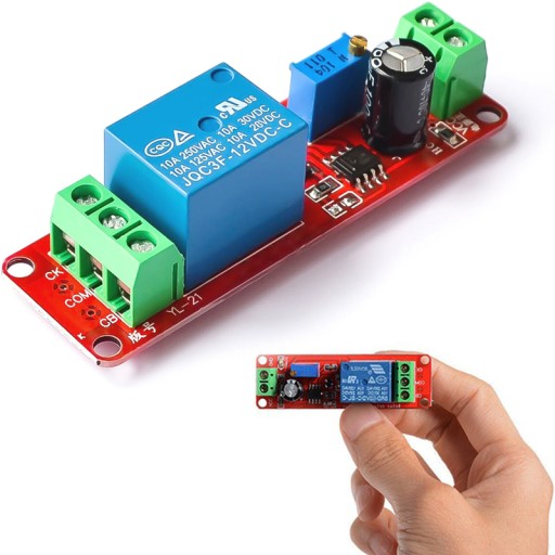 Jeśli szukasz przekaźnika czasowego który pozwoli na cykliczne wywoływanie akcji w Twoim projekcie zbudowanym w oparciu o Arduino lub Raspberry PI -to dobrze trafiłeś. Zegar opóźniający zaprojektowany na podstawie mikrokontrolera NE555 będzie idealnym wyborem. Dzięki uniwersalnemu zasilaniu 12V wykorzystasz te elementy które na pewno już posiadasz w swoim warsztacie a dzięki temu przyczynisz się do zmniejszenia produkcji elektrośmieci. Układ jest zbudowany za pomocą ponadczasowych komponentów które od lat cieszą bezawaryjnością oraz wszechstronnością zastosowań. Za pomocą wlutowanego w płytkę potencjometru, dostosujesz czas przełącznika w zakresie od 0 do 10 sekund. Wbudowany przekaźnik 10A 230V-AC 30V-DC pozwoli na sterowanie konstrukcjami które wymagają cyklicznej zmiany zasilania np. System kontroli prędkości wentylatorów w komputerze lub układ odstraszający gryzonie z użyciem dźwięków o wysokiej częstotliwości.