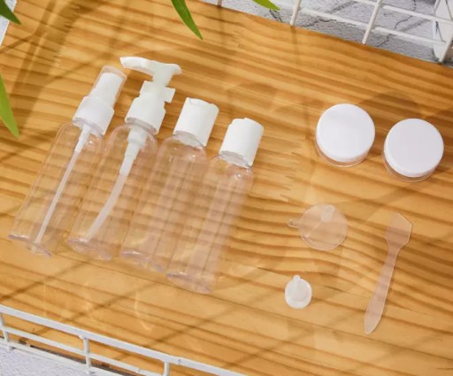 Zestaw pojemników podróżnych w przezroczystej kosmetyczce