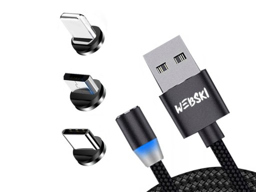 Webski Kabel jest uniwersalny jego 3 różne końcówki można zastosować do ładowania telefonów komórkowych, smartwatchów, tabletów, laptopów, słuchawek, power-banków. Jego końcówka posiada niebieskie podświetlenie Led