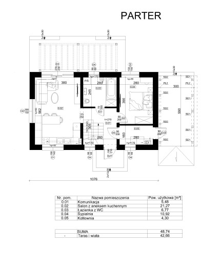 Budynek mieszkalny jednorodzinny z poddaszem użytkowym o powierzchni zabudowy <70 m2 (10,76 m x 6,5 m). Przedstawiany projekt jest rozwinięciem projektu PL4 - w ramach zmian zrezygnowano z garażu w budynku na rzecz sypialni oraz większej łazienki na parterze, natomiast w zamian doprojektowano wiatę przy budynku. Na parterze budynku salon połączony z kuchnią, łazienka z WC, kotłownia oraz wydzielona sypialnia. Za wejściem do budynku schody na poddasze. Na parterze pod schodami przestrzeń przeznaczona na szafę lub przestrzeń na odzież. W budynku zaprojektowano dodatkowe wejście do kotłowni przez wiatę ustawioną przy budynku.