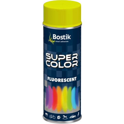 Lakier fluorescencyjny marki Bostik z efektem odblasku w kolorze żółtym.