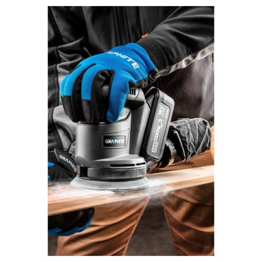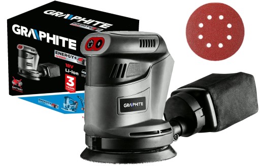Szlifierka mimośrodowa GRAPHITE, współpracująca z akumulatorami 18V Li-Ion GRAPHITE Energy+. Szlifierka posiada stopę o średnicy 125 mm z możliwością mocowania papieru ściernego na rzep. Urządzenie pracuje w trzech różnych prędkościach obrotowych: 5000/7000/9000 min⁻¹, którym odpowiadają częstotliwości oscylacji: 10000/14000/18000 min⁻¹. Amplituda oscylacji wynosi 2.7 mm. Miejsce chwytu pokryte zostało materiałem antypoślizgowym, dlatego elektronarzędziem można pracować bezpiecznie i komfortowo - także jedną ręką.