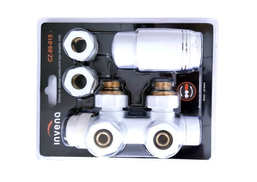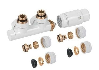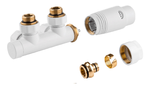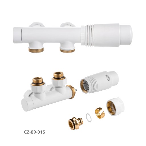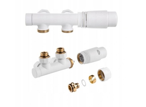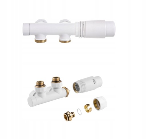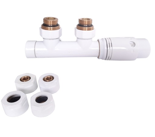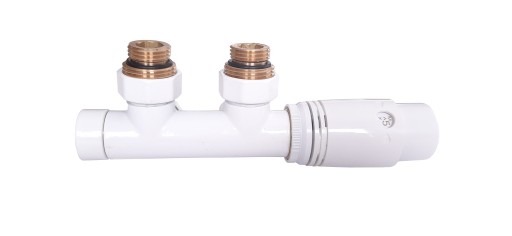 Zestaw do dolnego podłączenia grzejnika łazienkowego ale także ozdobnego o rozstawie przyłączeniowym 50mm, komplet w kolorze białym.