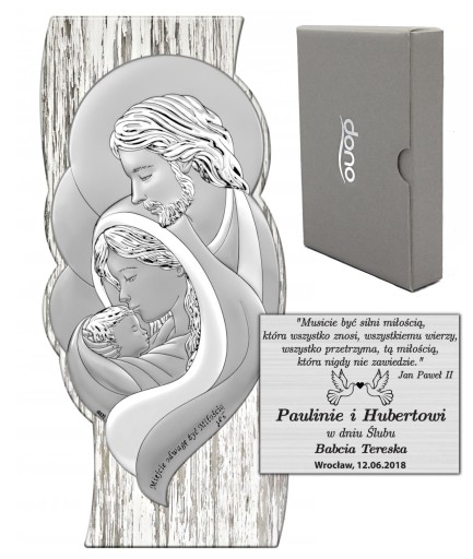 Pamiątka włoskiej firmy DONO z wizerunkiem Świętej Rodziny. Całość została zamknięta w kształcie prostokąta zdobiona białym drewnem wraz z cytatem Jana Pawła II " Miejcie odwagę żyć Miłością " . Obrazek został osadzony na jasnym lakierowanym drewnie. Dzięki wkładanej podpórce obrazek możemy umiejscowić na komodzie lub powiesić na ścianie. Całość wykonana ze szlachetnych surowców najwyższej jakości, opatrzona estetycznym opakowaniem.