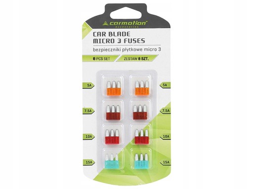 W zestawie 8 bezpieczników mini uniwersalnych o amperach: