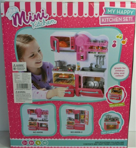 Zestaw kuchenny zawiera naklejki, artykuły spożywcze, garnek, patelnię, oraz inne przydatne akcesoria. Fronty mebli są różowo-brokatowe.