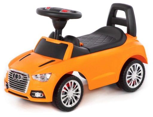 Jeździk super cars o pięknym wyglądzie koloru pomarańczowego. Posiada imitacje chromowanych powierzchni takich jak felgi reflektory oraz grille. Posiada muzyczna kierownice z 4 przyciskami: klakson, dźwięk pracującego silnika oraz efekty dźwiękowe. Pod siedziskiem znajduje się schowek do przechowywania swoich drobiazgów. Zabawka rośnie razem z dzieckiem. Pojazd może służyć jako jeździk lub pchacz, przy który dziecko może się uczyć chodzić. Jeździk jest wyposażony w szerokie koła i wygodne sterowanie, oparcie zabezpiecza dziecko przed przechyleniem do tyłu.