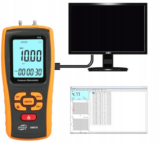 Urządzenie oferuje nam możliwość odczytu wyników pomiaru w aż 11 jednostkach. Manometr wyposażony jest w port USB, który umożliwia podłączenie do komputera i odczytanie wyników pomiaru za pomocą dedykowanego oprogramowania (płyta CD w zestawie).