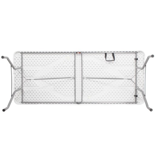Blat stołu turystycznego jest gruby, masywny i posiada zaokrąglone ranty. Wykonanie z najlepszych jakościowo materiałów gwarantuje udźwig do 150 kg. Warto podkreślić, że specjalnie wyselekcjonowany materiał HDPE wybrany dla blatu jest odporny na zmienne warunki atmosferyczne.