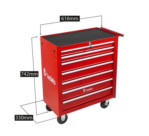 Ten wózek narzędziowy wyposażony jest w 7 pojemnych szuflad - poniżej ich wymiary: