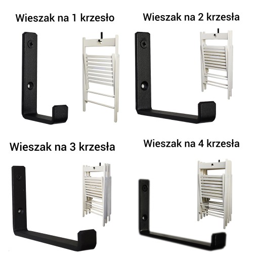 Wieszaki robimy z płaskownika 30x5 mm i kształtownika 20x20 mm. Wymiary wieszaka wysokość 15 cm i długość 47,5 cm, przystosowany na 7 krzeseł, możemy zrobić wieszaki na 1,2,3 lub 4 krzesła (dostępne są na innych aukcjach)