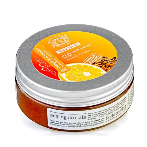 Solno – cukrowy peeling do ciała o pięknym zapachu soczystej pomarańczy ze szczyptą cynamonu. Mieszanka kryształków soli i cukru dokładnie oczyszcza skórę i idealnie ją wygładza. Zawarte w peelingu masło Shea i roślinne olejki: winogronowy, ze słodkich migdałów i sojowy pielęgnują skórę, głęboko ją nawilżają i odżywiają. Skóra po użyciu peelingu solno - cukrowego jest dokładnie oczyszczona, miękka, jedwabiście gładka i pachnąca.