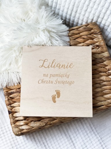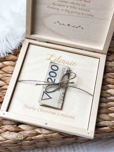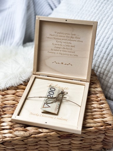 Personalizowane pudełko na Chrzest Święty, do którego można schować pieniądze przewiązane sznurkiem jutowym. Będzie to wyjątkowy prezent, zastępujący papierową kartkę oraz pamiątka na długie lata!