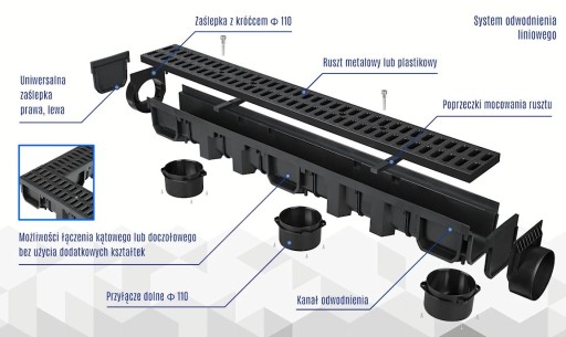 Odwodnienie liniowe - KOMPLET - suchy syfon + przyłącze dolne pod syfon ? 110 + sitko