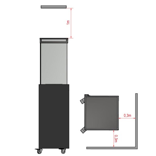 Ogrzewacz tarasowy Faro można umieścić w dowolnym miejscu! Ważne jest jednak, aby zachować bezpieczną odległość od materiałów łatwopalnych – co najmniej 0,3 m wokół urządzenia i 1 m nad nim. Biorąc pod uwagę, iż ten kominek gazowy wraz z kółkami ma 1,5 m wysokości, dach musi być na wysokości przynajmniej 2,5 metra.