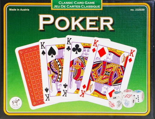 Klasyczne, wysokiej jakości karty i kości do pokera. W efektownym pudełku talia 55 plastikowanych kart o pokerowym wymiarze 63 x 88 mm i gramaturze 310 oraz 5 kości z figurami.